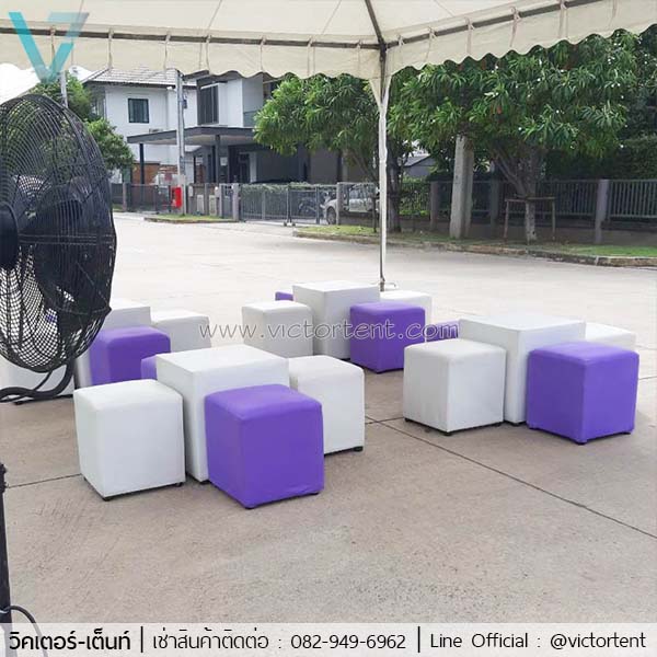 เช่าเก้าอี้สตูสีขาว สีม่วง หรือเช่าเป็นชุด ราคาตัวละ 90 บาท เช่าเป็นชุด ๆ ละ 450 บาท