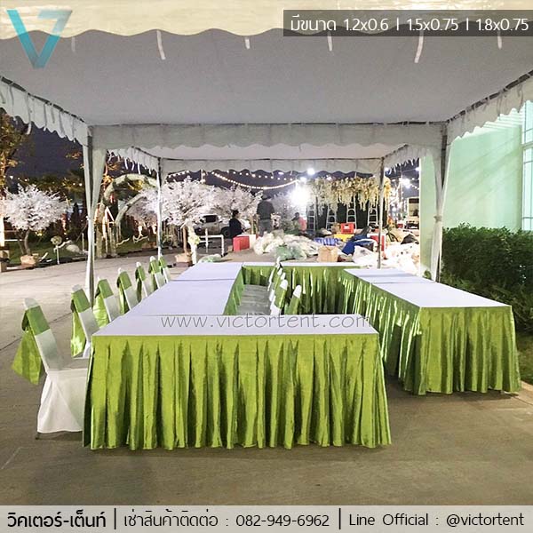 เช่าโต๊ะเหลี่ยม เช่าโต๊ะคลุมผ้าสเกิร์ตสีเขียวตองอ่อน ราคาเช่าตัวละ 350 บาท ถ้าใช้งานหลายตัวมีส่วนลดพิเศษ