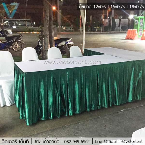 เช่าโต๊ะเหลี่ยมสีเขียว เช่าโต๊ะคลุมผ้าสเกิร์ตสีเขียวตองอ่อน ราคาเช่าตัวละ 350 บาท ขนาด .75×1.8x.75 ม.