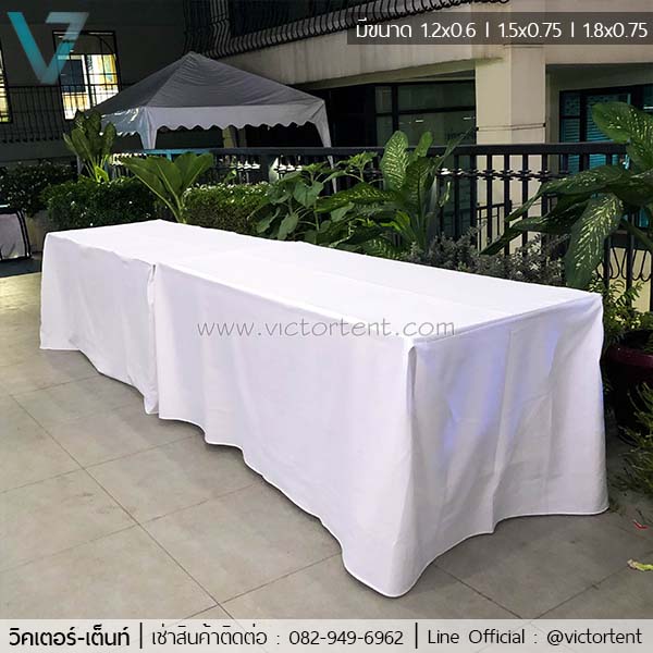เช่าโต๊ะเหลี่ยมหน้าขาว ไม่คลุมผ้าตัวละ 150 บาท คลุมผ้าตัวละ 250 บาท