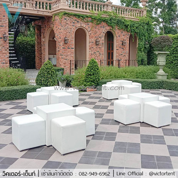 เช่าเก้าอี้เต๋า เช่าโต๊ะและ เก้าอี้ลูกเต๋าสี่เหลี่ยมสีขาว ราคาเช่าตัวละ 90 บาท ชุดละ 500 บาท ประกอบด้วยโต๊ะ 1 ตัว เก้าอี้ 4 ตัวถ้าเช่าหลายตัวราคาพิเศษ