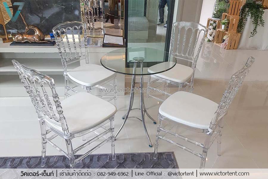 เช่าโต๊ะ ให้เช่าโต๊ะกระจก พร้อมเก้าอี้อะคริลิคใส 4 ตัว ราคาเช่าชุดละ 900 บาท เช่าหลายชุดได้ส่วนลดพิเศษ