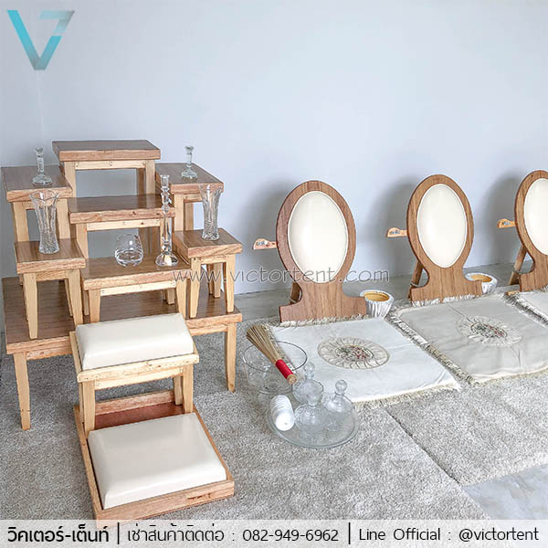 เช่าชุดพิธีสงฆ์สีไม้ธรรมชาติ พร้อมอุปกรณ์แก้วครบชุด ราคาเช่าชุดละ 3500 บาท