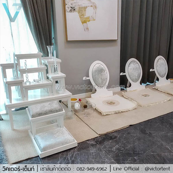 เช่าโต๊ะหมู่-อาสนะสงฆ์ สีขาว เช่าโต๊ะหมู่และอาสนะสีขาวเงิน พร้อมอุปกรณ์แก้วสำหรับงานทำบุญบ้าน งานขึ้นบ้านใหม่ ราคาเช่าชุดละ 3500 บาท