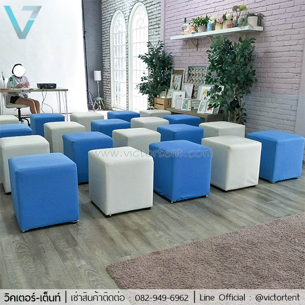 ให้เช่าเก้าอี้ลูกเต๋าสีขาว และสีฟ้า ราคาตัวละ 90 บาท ใช้งานหลายตัว ให้ราคาพิเศษ