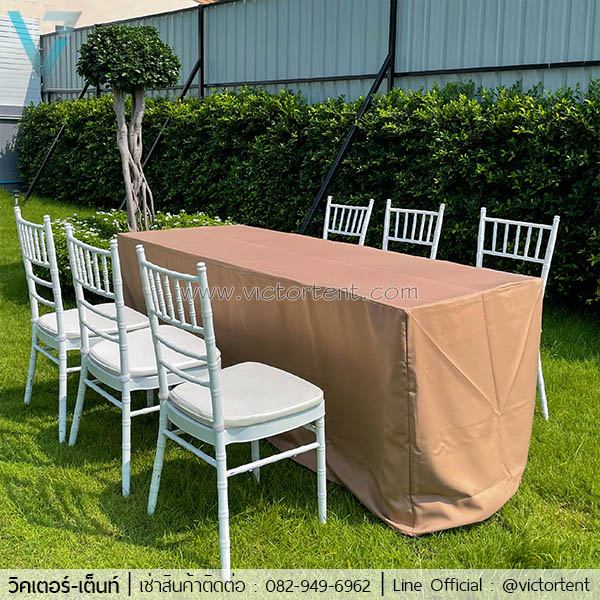 ให้เช่าโต๊ะเหลี่ยมหน้าขาวพร้อมคลุมผ้าสีน้ำตาลในราคาเพียง 250 บาท