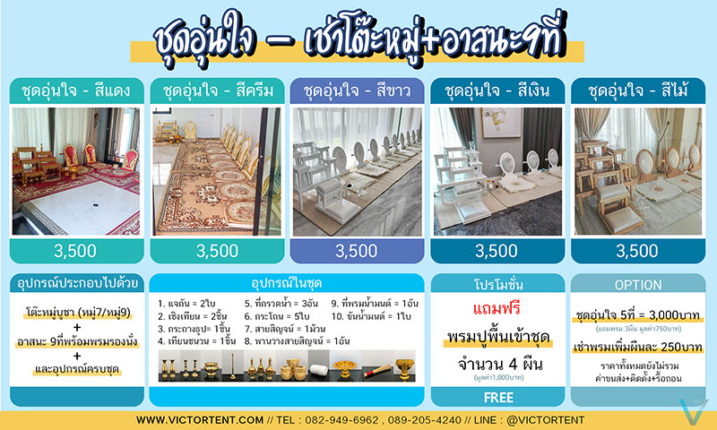 เช่าโต๊ะหมู่ อาสนะ ให้เช่าชุดโต๊ะหมู่ อาสนะ ราคาเพียงชุดละ 3500 บาท และยังมีโปรโมชั่นคือแถมพรมไปเลย 4 ผืน!