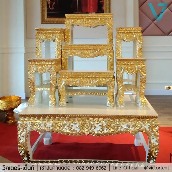 โต๊ะหมู่บูชาให้เช่า ให้เช่าชุดโต๊ะหมุ่บูชาสีครีมทอง หมู่ 7 สไตร์ไทยๆ พร้อมอุปกรณ์ทองครบชุด ราคาเช่าชุดละ 1500 บาท