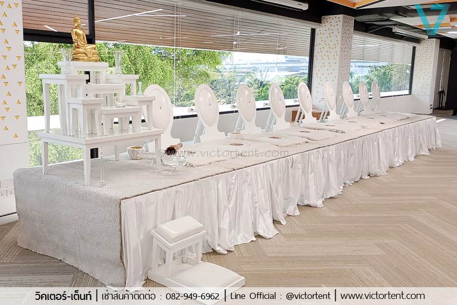 ให้เช่าชุดอุปกรณ์ทำบุญบ้านโดยประกอบด้วย เวที+โต๊ะหมู่บูชา+อาสนะ ราคาสุดคุ้ม 9000 บาท