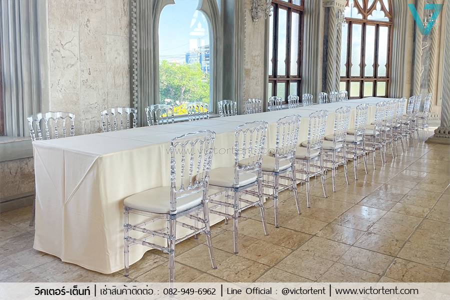 ให้เช่าเก้าอี้คริสตัล+โต๊ะคลุมผ้า ราคาเพียงชุดละ 1100 บาท