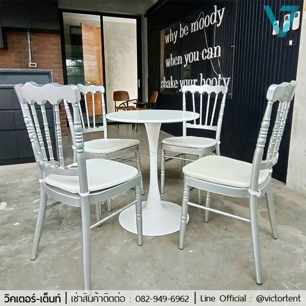 เช่าเก้าอี้สีเงิน บริการให้เช่าชุดโต๊ะเจรจา เช่าเก้าอี้ชิวารีสีเงิน เช่าชุดโต๊ะปิดการขาย ราคาเริ่มต้นที่ชุดละ 800 บาท ถ้าเก้าอี้ 4 ตัว ชุดละ 900 บาท