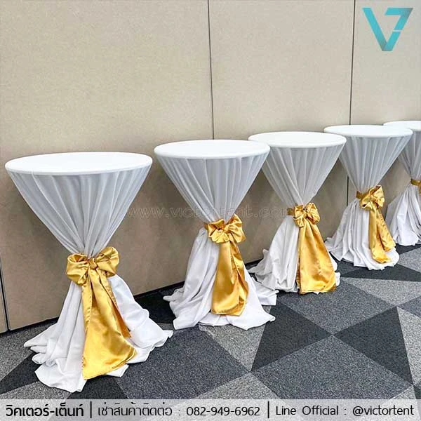 โต๊ะบาร์สูงเช่า ให้เช่าโต๊ะบาร์สูง เช่าโต๊ะค็อกเทล พร้อมผ้าคลุมสีขาว+โบว์ทอง ราคาเพียงตัวละ 500 บาทเท่านั้น