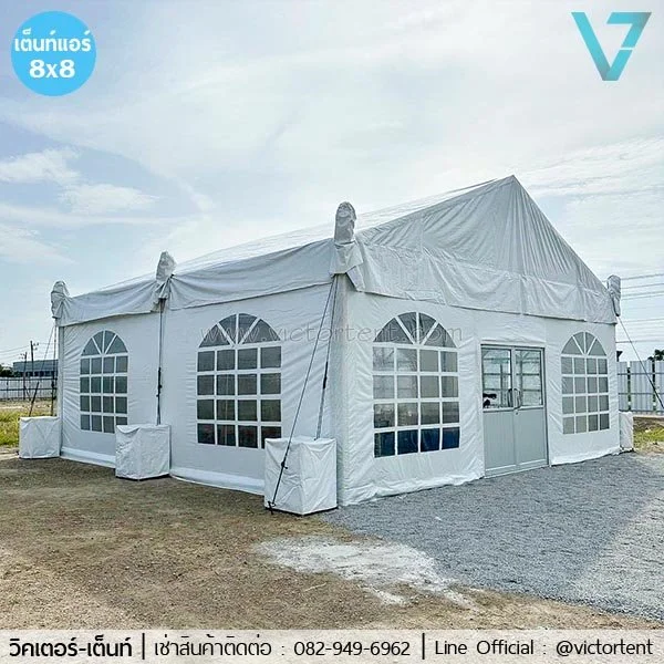 เช่าเต็นท์แอร์ ให้เช่าเต็นท์ขนาด 8×8 เมตร พื้นที่ใช้สอยภายในอยู่ที่ 36 ตร.ม. โดยภายในมีแอร์ขนาด 36000 BTU ให้ถึง 4 ตัว รับรองว่าเย็นทั่วถึงแน่นอน
