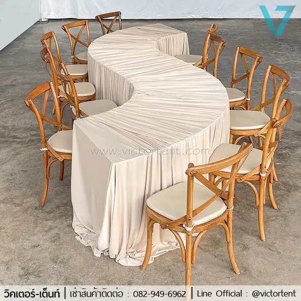 บริการให้เช่าชุดโต๊ะโค้ง+เก้าอี้ไม้ครอสแบ็ค ราคาชุดละ 3000 บาทเท่านั้น