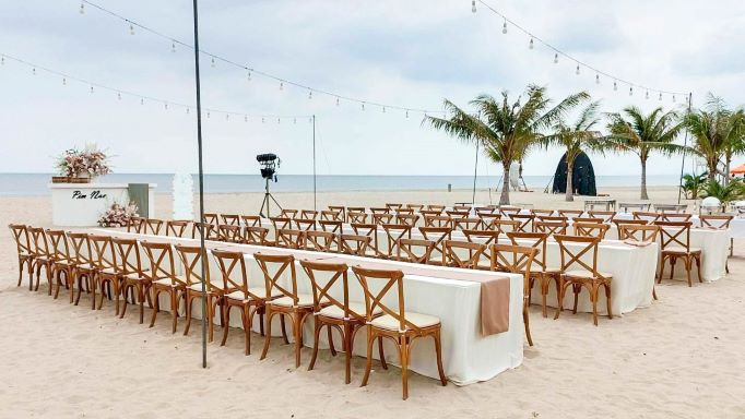 ให้เช่าเก้าอี้ไม้งานแต่งราคาสุดคุ้ม เก้าอี้ไม้ครอสแบ็ค แต่งงานริมทะเล ผ้าคลุมสีครีม